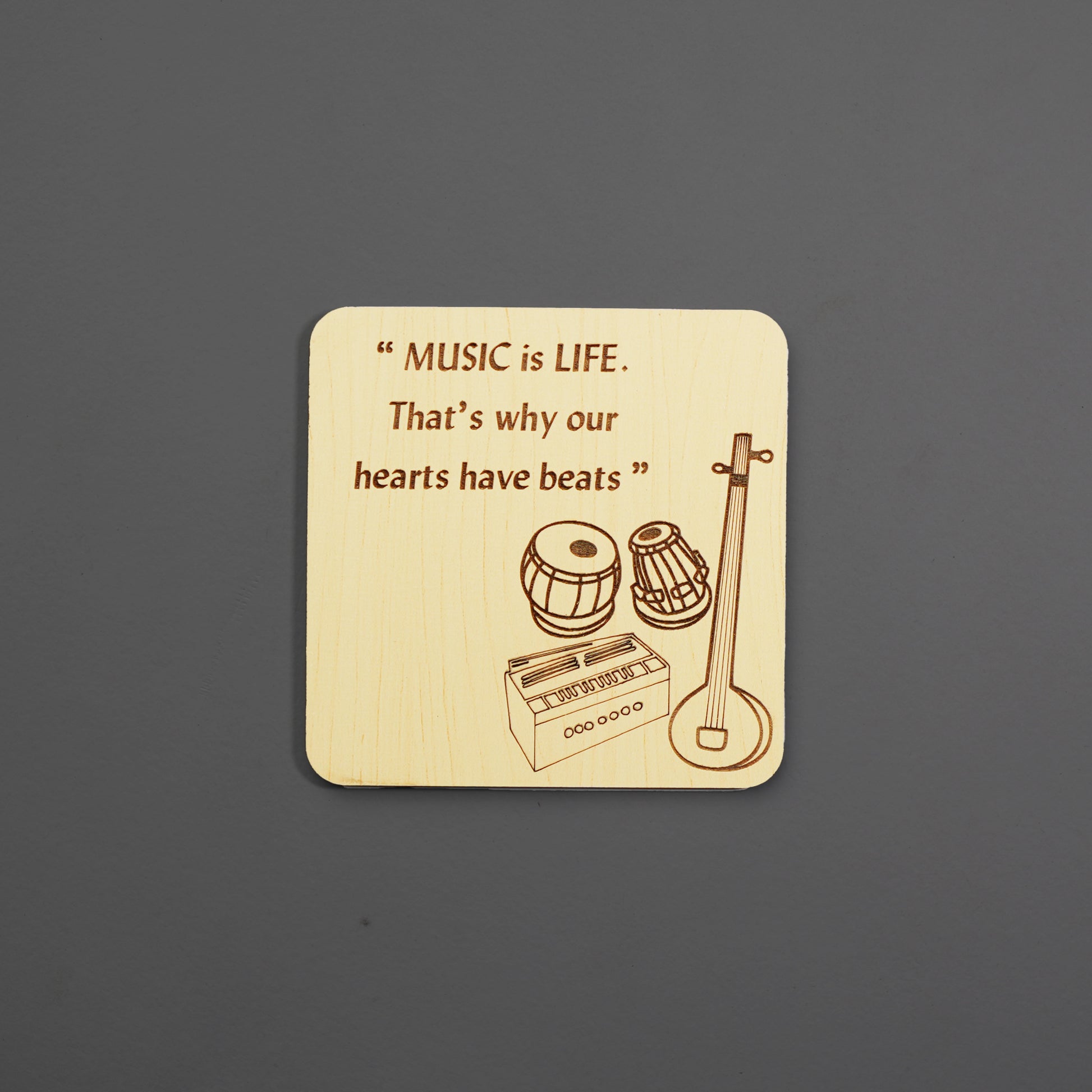 Elegant fridge magnet showcasing intricately engraved Indian classical music instruments, supported by a magnetic sheet at the back.