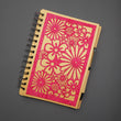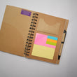 Eco-friendly A5 notepad with a printed cover design, sticky notes, and an eco pen. Includes 80 ruled pages, fully recyclable except for the spiral binding.