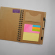Eco-conscious A5 notepad with a stylish printed cover, sticky notes, and an eco pen. Designed with 80 ruled pages, recyclable except for the spiral binding.