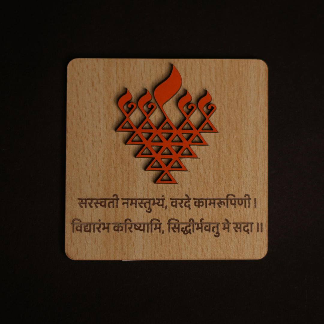 Elegant fridge magnet showcasing the Saraswati Mantra in intricate engraving, supported by a magnetic sheet at the back.
