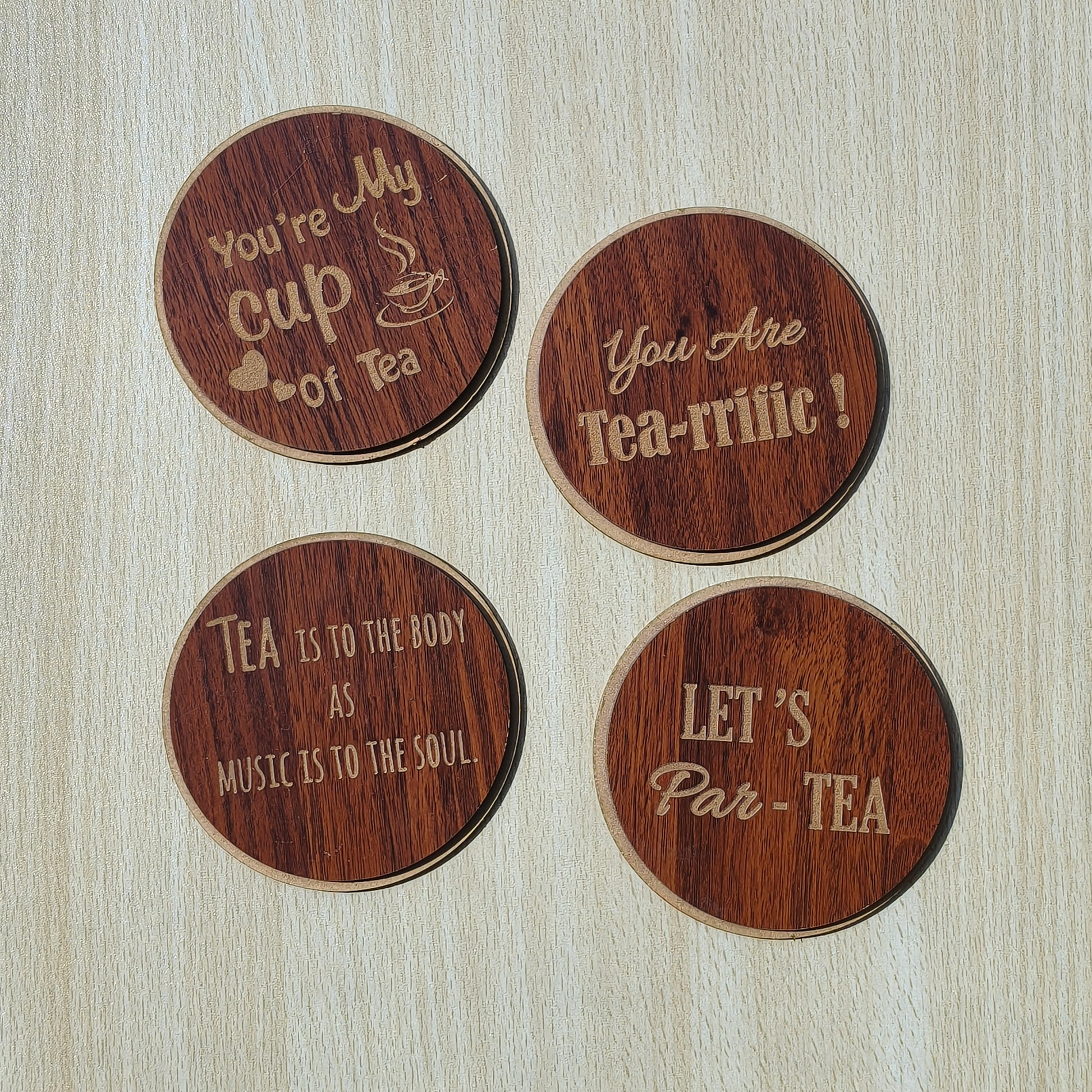 Set of 4 tea coasters featuring engraved tea-themed quotes. Made from laminated MDF, 3.5 inches in diameter and 4mm thick.
